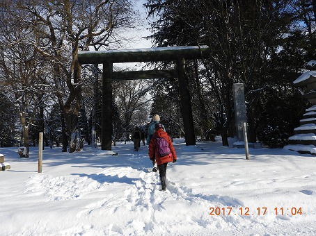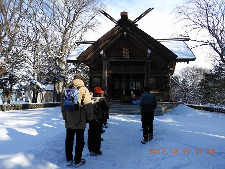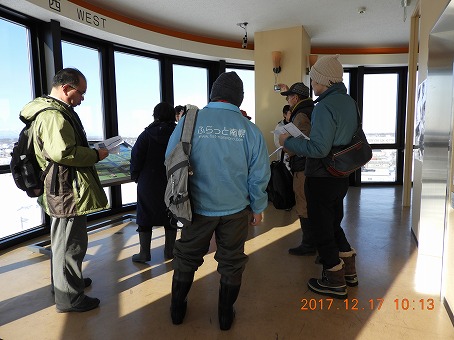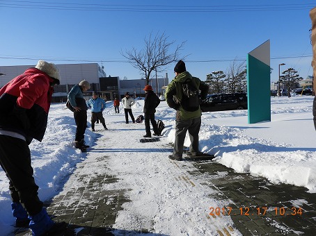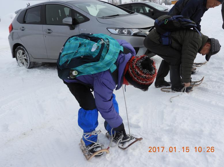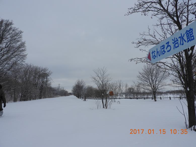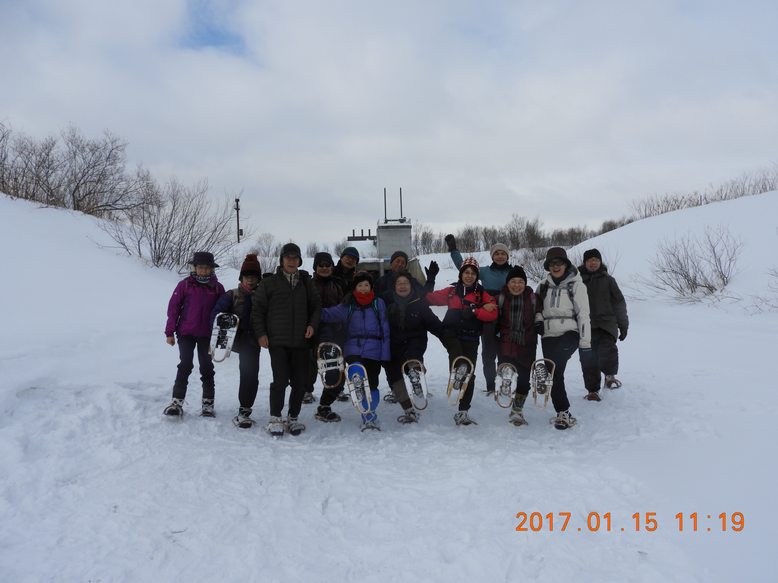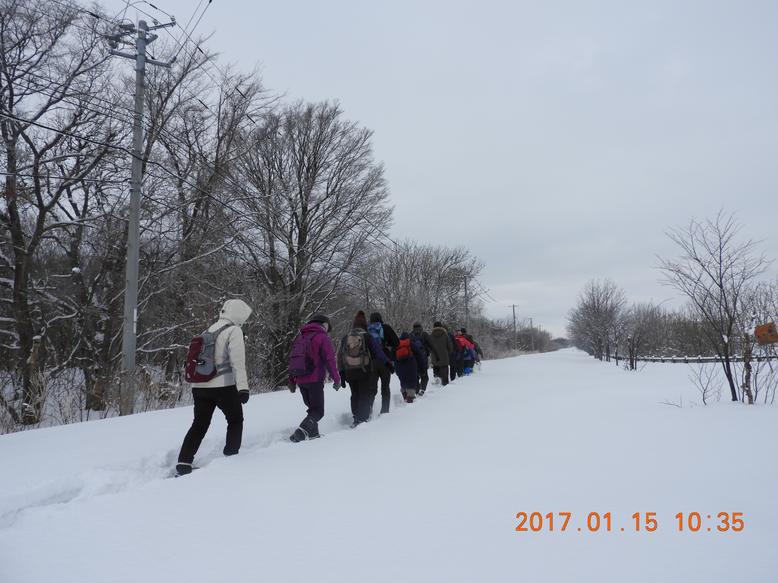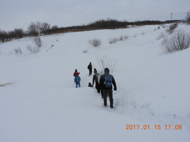 新春運恒例のかんじきで雪原を歩きました。15名の参加者は、運河や堤防を気持ちよく走破しました。